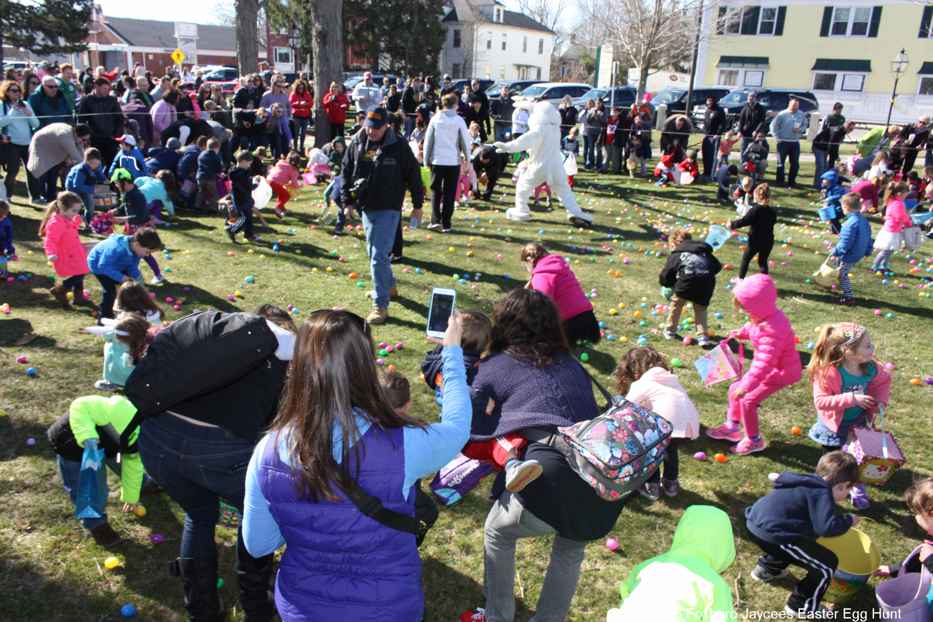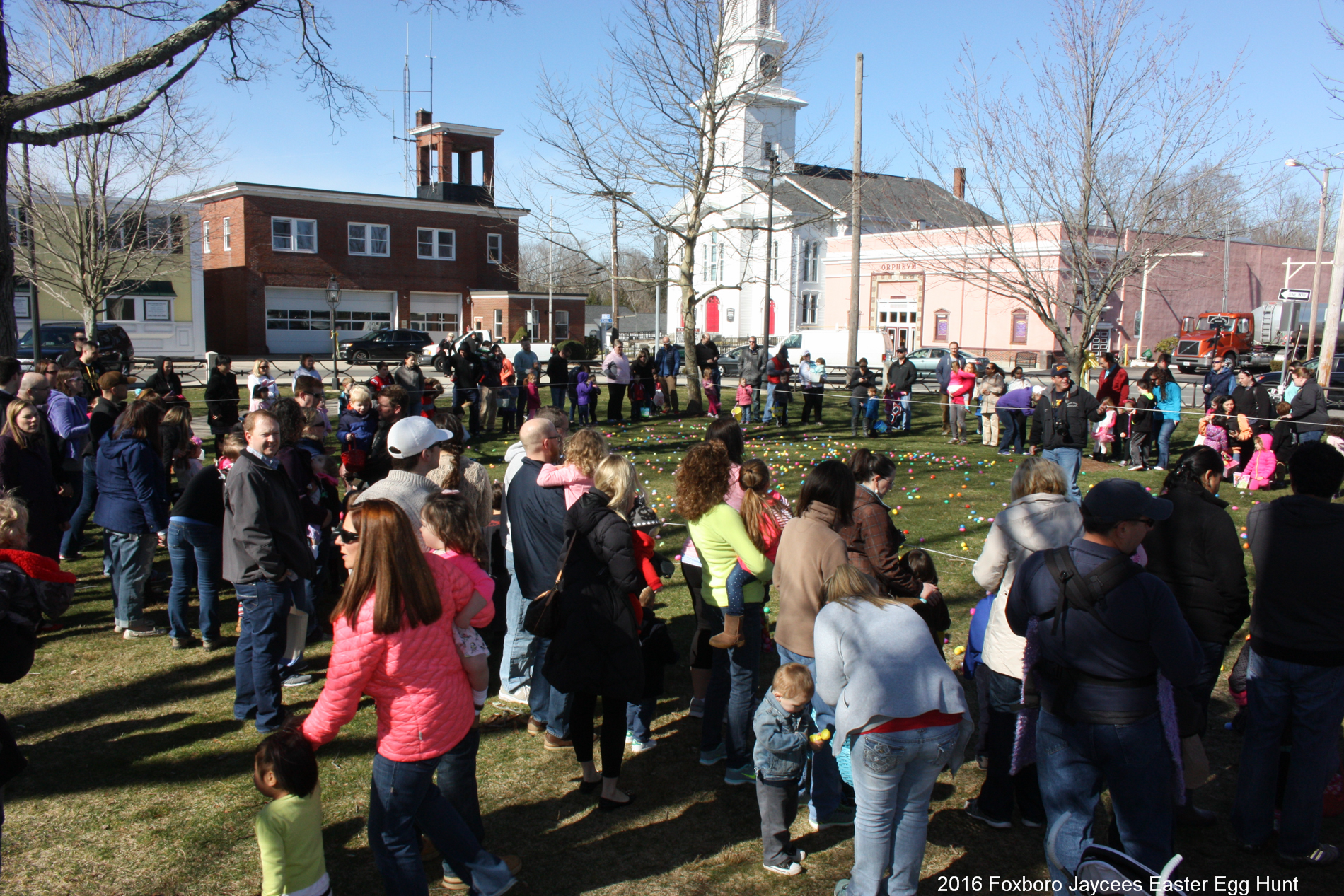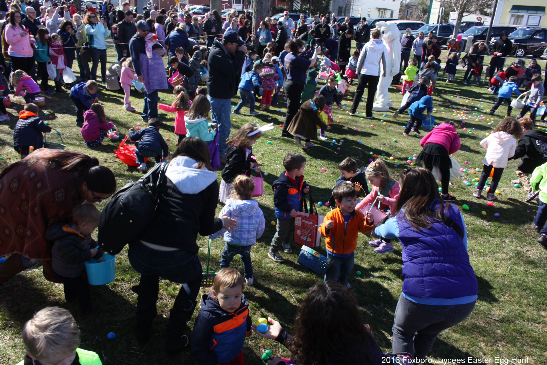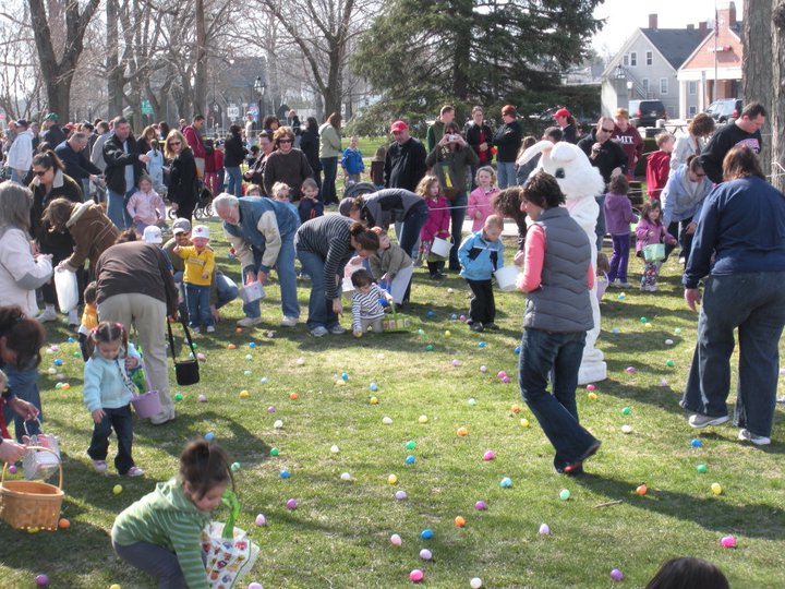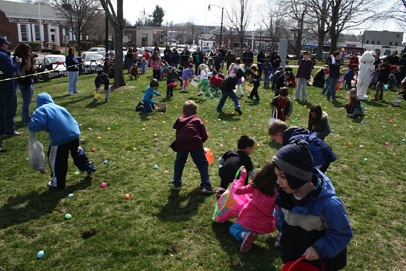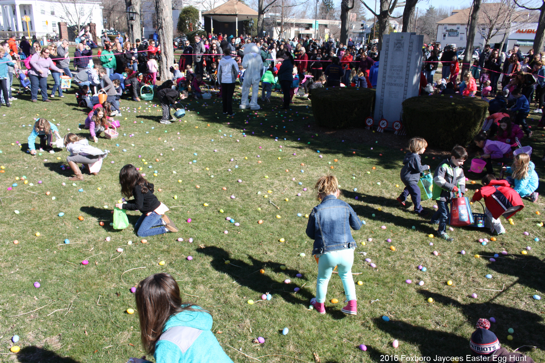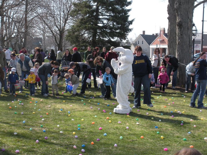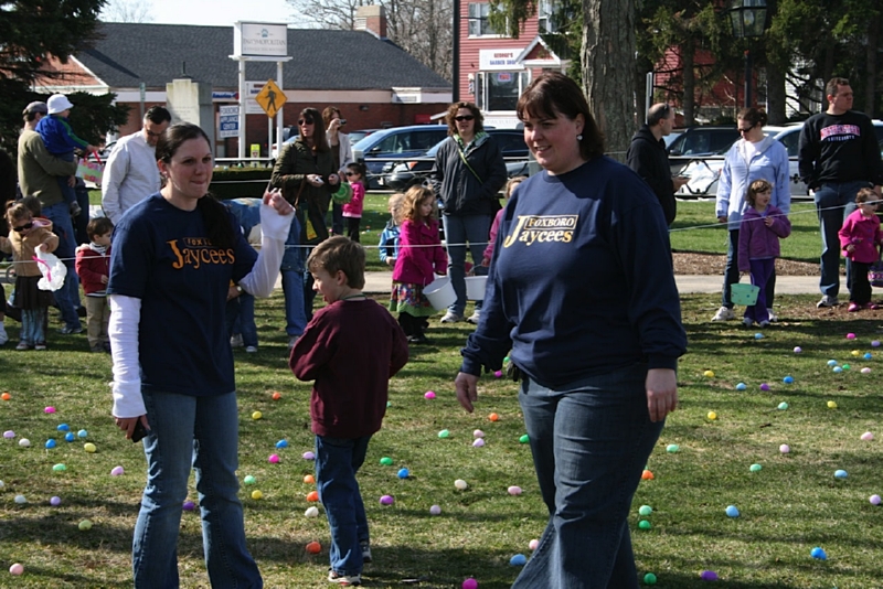 For over 35 years, each spring, right before Easter, the Foxboro Jaycees fill over 3500 (yes, three thousand and five hundred!) plastic eggs with candy and scatter them across Foxboro Common. (It’s not really a “hunt” because the thousands of eggs are everywhere so everyone gets a good bounty of goodies!)